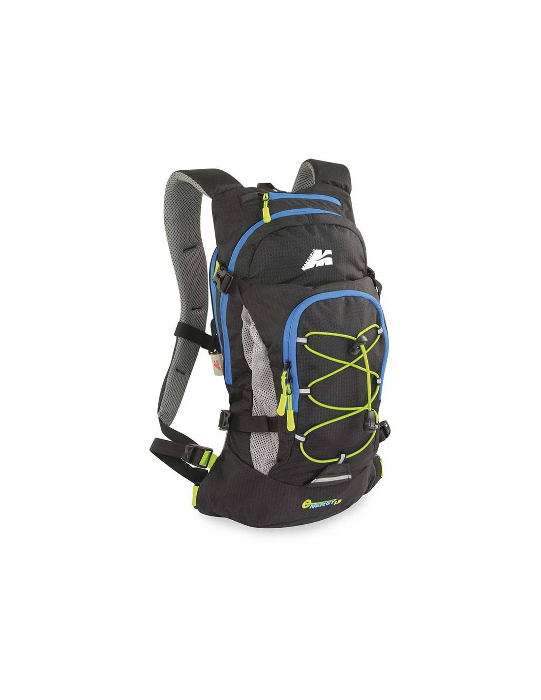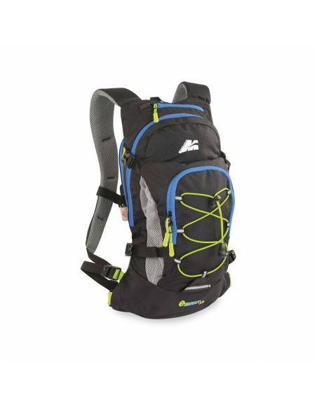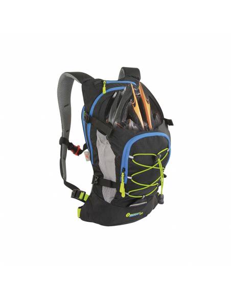 Mochila de running y bicicleta muy ligera y práctica. Está equipada con OVAL SYSTEM relleno de material transpirable. Tiene correas acolchadas y ajustables para los hombros y una correa deslizante para el pecho con silbato de emergencia. Cuenta con varios bolsillos, uno en la parte superior, 2 en la parte delantera, uno es un soporte de casco ajustable con correas de compresión laterales, un organizador para objetos y una banda elástica ajustable con reflectante. Dispone de bolsillo trasero para guardar la bolsa de agua del sistema de hidratación.