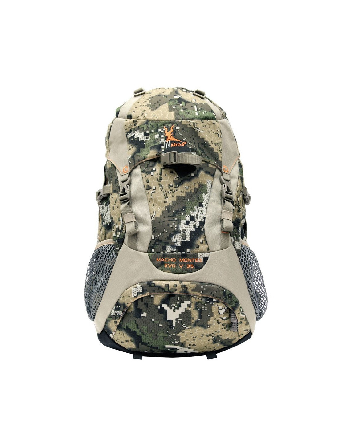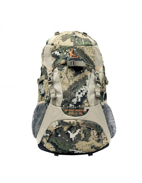 Está equipada con una aza fluorescente de color naranja y dispone de sistema de ventilación para la zona de la espalda para eliminar el sudor. Fabricada con materiales impermeables, resistentes y silenciosos con zonas acolchadas para un mayor confort y estabilidad. El modelo Macho Montes Evo V 35 lt. Es totalmente flexible debido a su diseño ergonómico y dispone de correas ajustables para el pecho aportando una gran comodidad y reparto del peso. Cuenta con cremalleras YKK, 6 bolsillos, un compartimento, una bolsa protectora y un bolsillo opcional para el arma. Además viene equipado con el sistema Hidro Pack para poder hidratarnos en todo momento. Este modelo está disponible en tres tonalidades: Camo Maxi 1, Camo Disolve Veil y Verde. Garantía de 15 años.